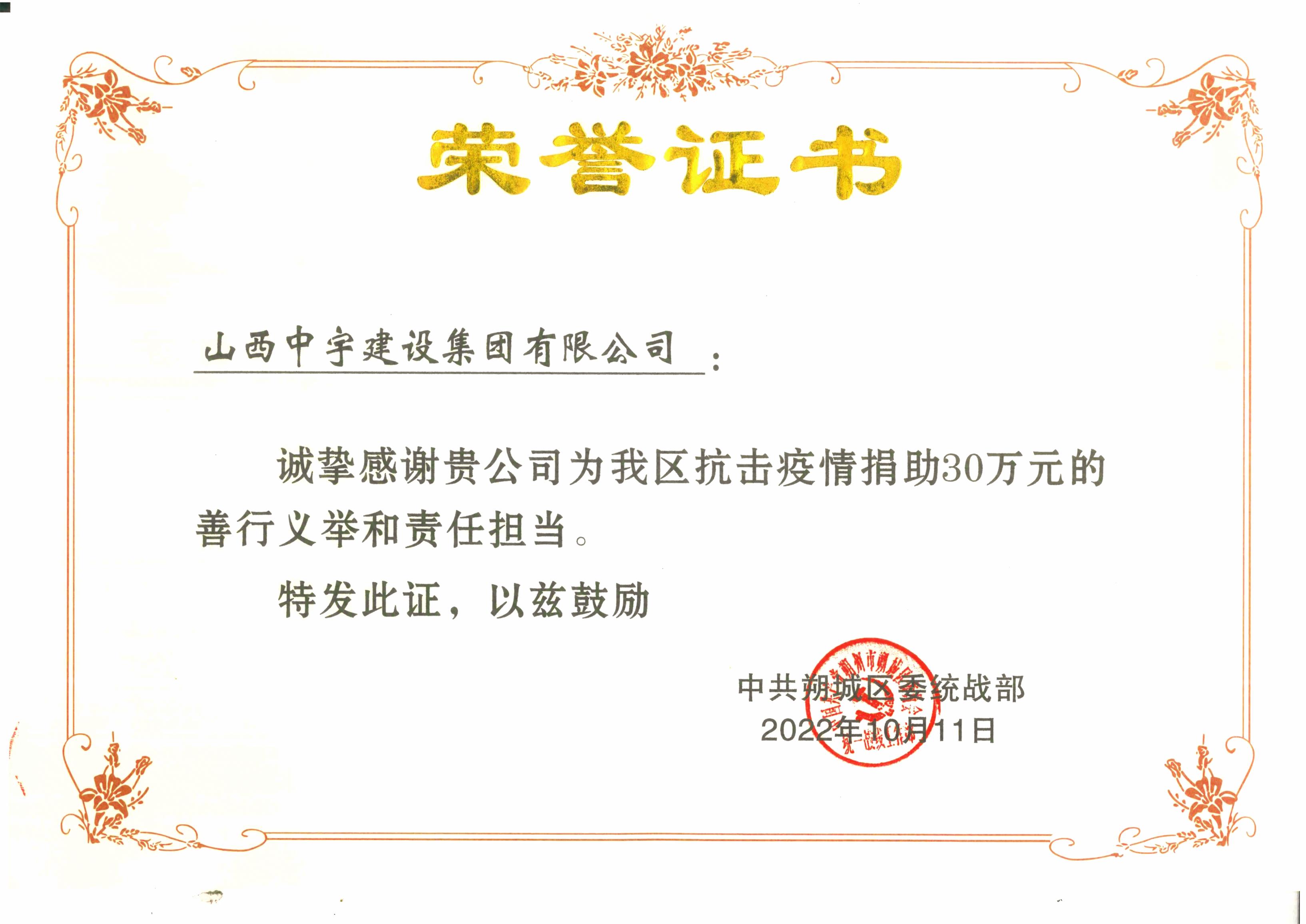 2022年捐助紅十字會(huì)30萬元榮譽(yù)證書